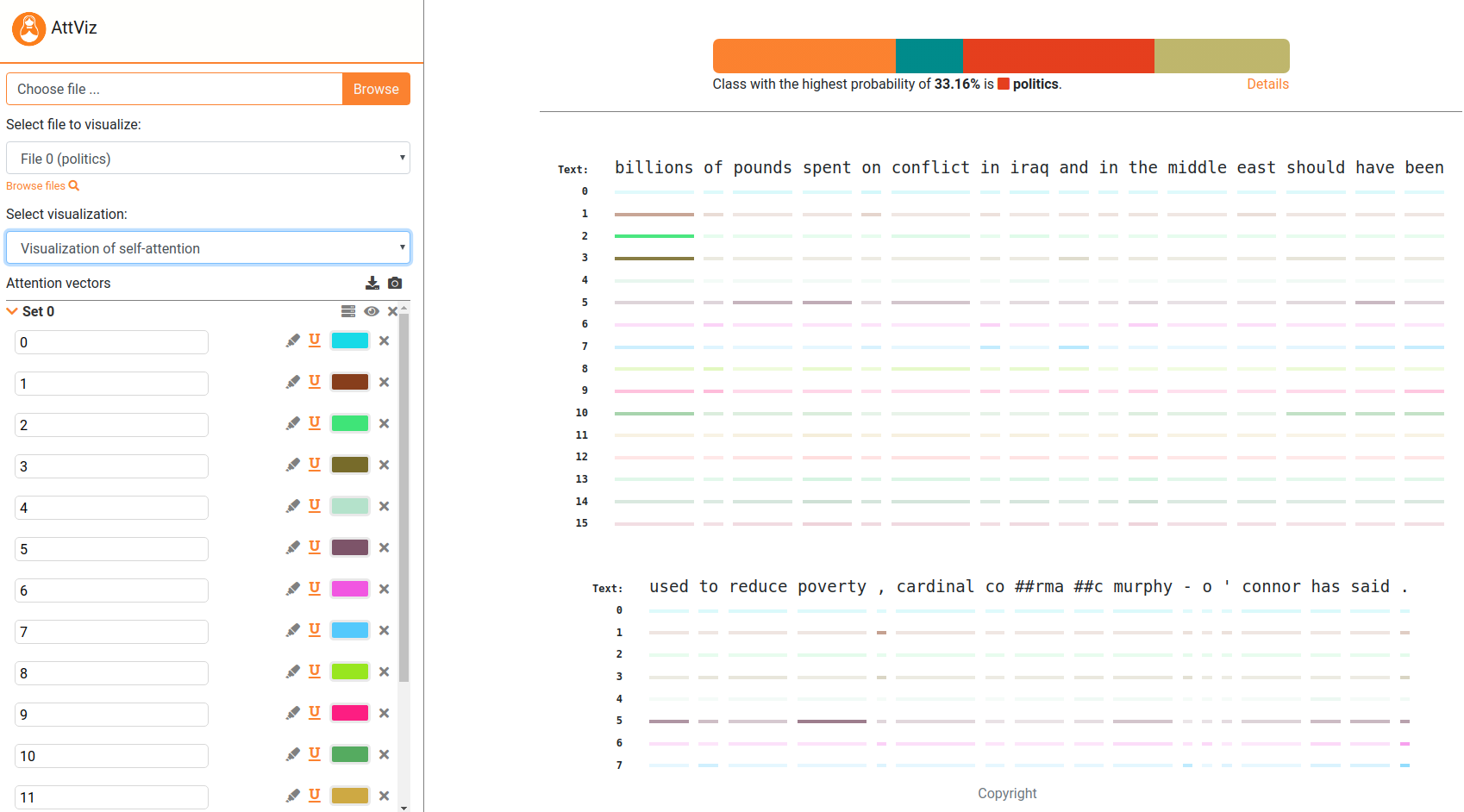 BertViz is an interactive tool for visualizing attention in Transformer language models such as BERT, GPT2, or T5. It can be run inside a Jupyter or Colab notebook through a simple Python API that supports most Huggingface models. BertViz extends the Tensor2Tensor visualization tool by Llion Jones, providing multiple views that each offer a unique lens into the attention mechanism.