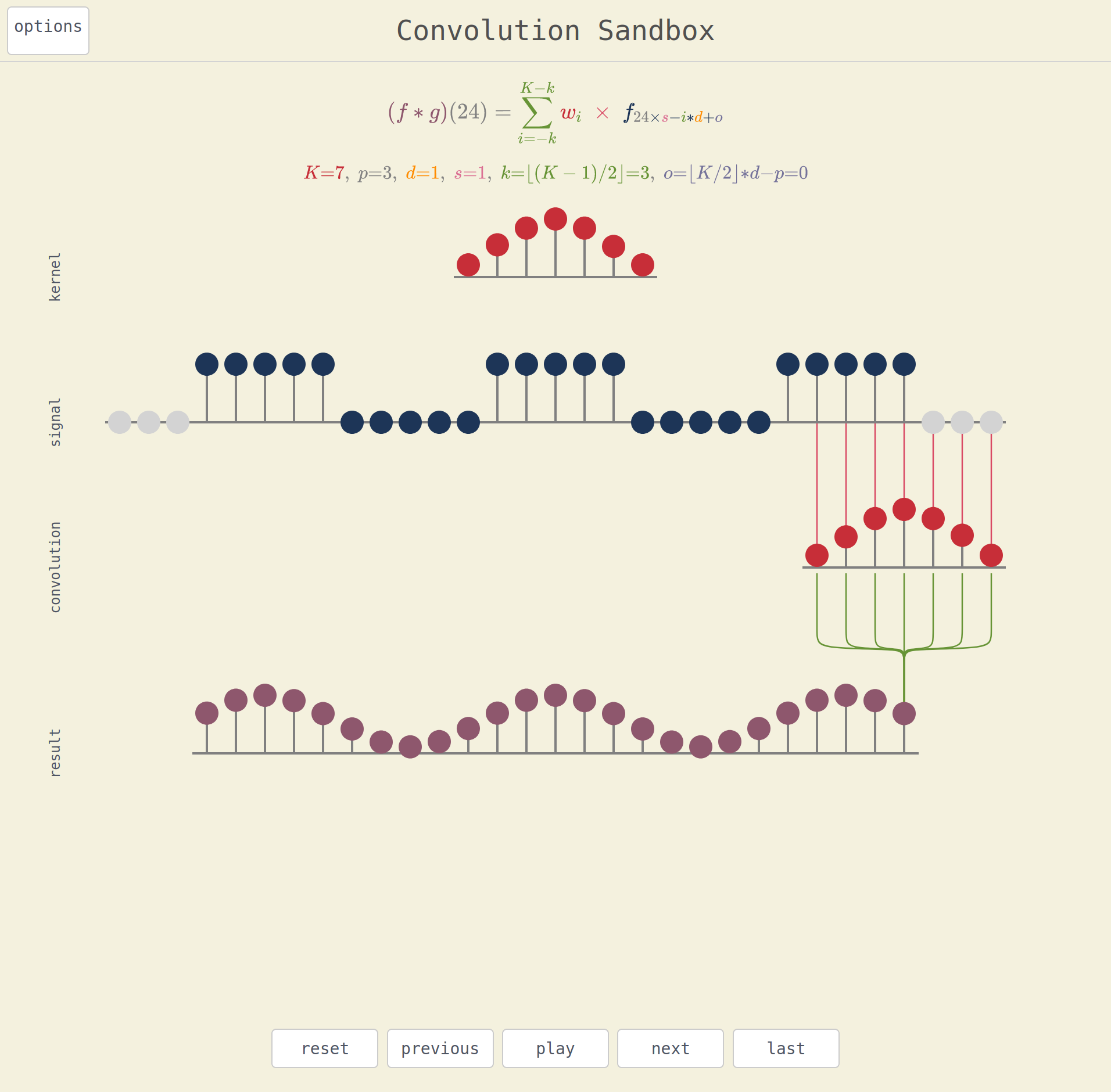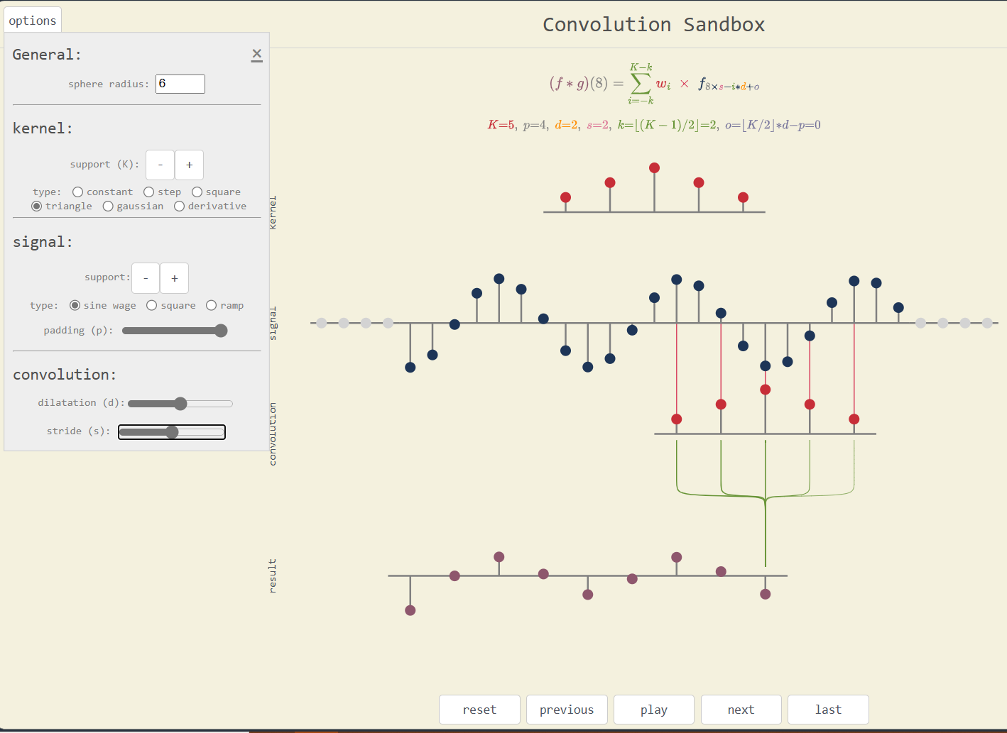 User can select different kernels and input signals among the predefined functions. Another option drag the dots to the wanted level. The app also illustrates the importance of the padding, the dilatation and stride parameters.