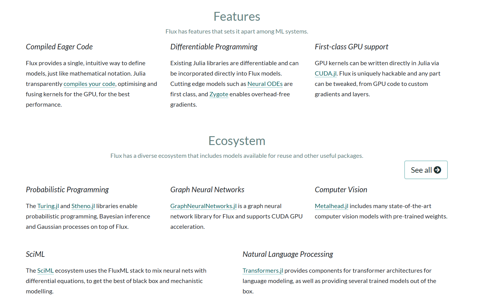 Flux is a 100% pure-Julia stack and provides lightweight abstractions on top of Julia’s native GPU and AD support. It makes the easy things easy while remaining fully hackable.